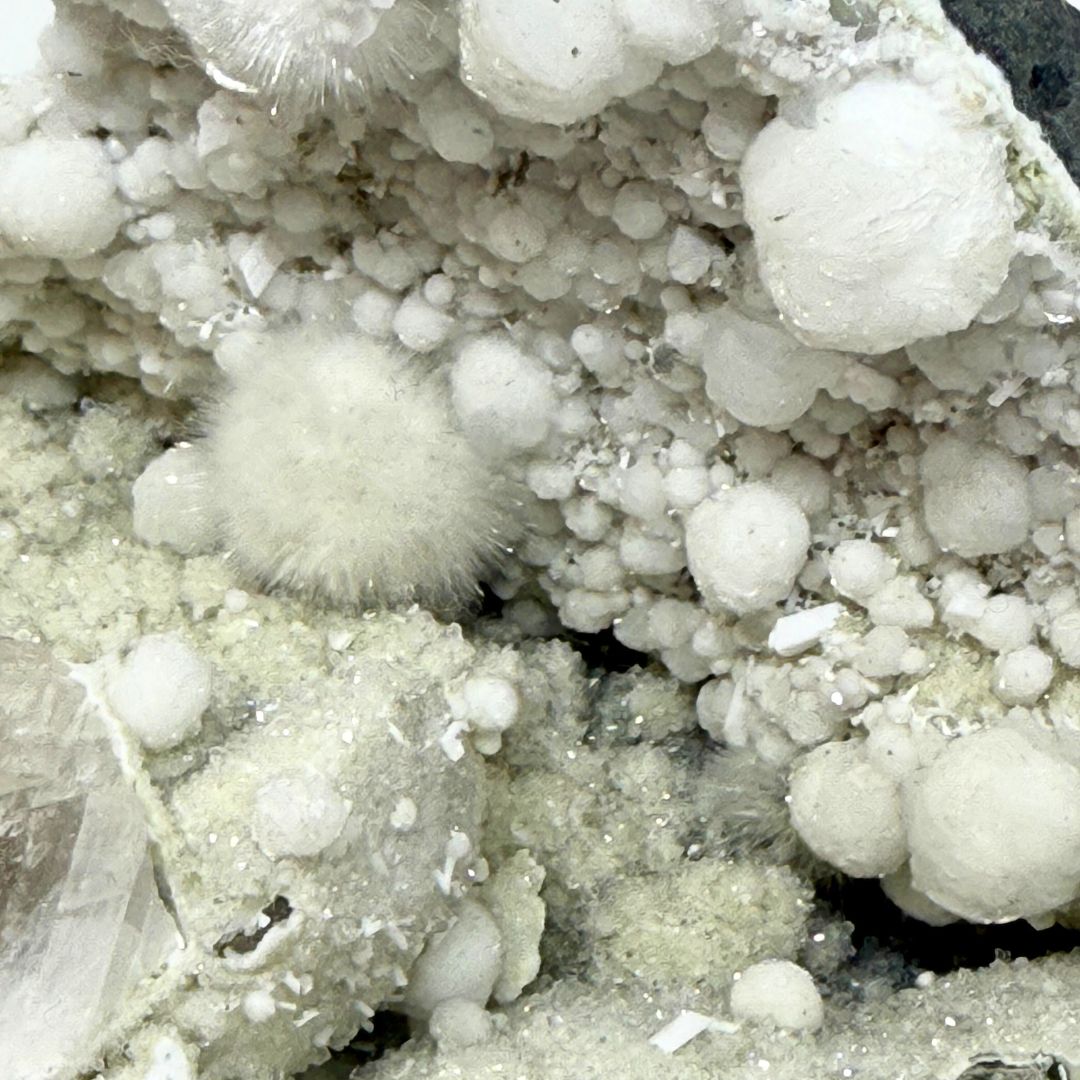 L’okanite est un minéral unique qui se distingue par son apparence délicate, presque irréelle. En géologie, elle se forme principalement dans les cavités volcaniques appelées géodes ou amygdales, où les minéraux ont l’espace nécessaire pour cristalliser librement. L’okanite se présente sous forme de fines fibres cristallines qui créent un effet visuel semblable à un nuage ou à une boule de coton. Cette texture douce est naturelle — mais fragile —, résultat d’une croissance minérale radiale extrêmement fine.